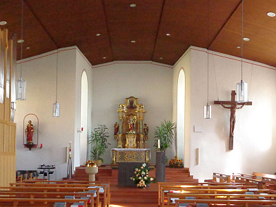 Die Erweiterung der der Kapelle zu einer Kirche wurde 1954 vollzogen; die Rokoko-Saal-Kapelle wurde zu einer Kirche mit Kreuzgrundriß (Architekt Dietrich)