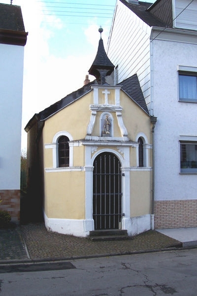 [...] Putzbau des frühen 18. Jahrhunderts, der mit seiner unregelmäßigen dreiseitigen Fassade in den Straßenraum rückt. Der bescheidene, verputzte Bruchsteinbau wird von der sandsteingegliederten Fassade reizvoll hervorgehoben; ihr Gliederungsgerüst diente wohl der Löschemer Kapelle als Vorbild. Der unbefangen kombinierende Formenapparat, der auf einen regional tätigen Baumeister schließen läßt, ist konsequent eingesetzt. .