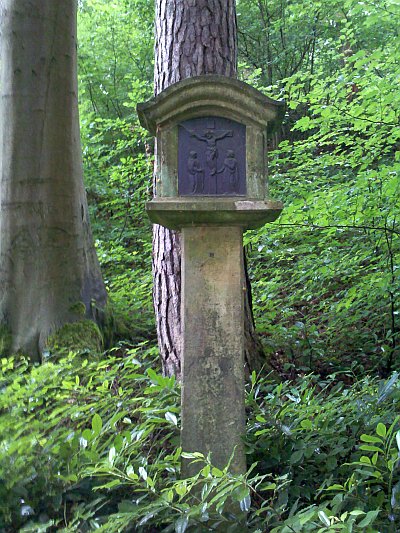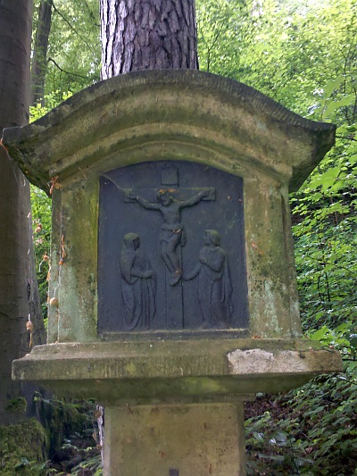 Von den ehemals 14 Kreuzwegstatiorfen fehlt die erste. Die Datierungen an der zweiten (1820) und an der neunten Station (1810) grenzen den Errichtungszeitraum ein.