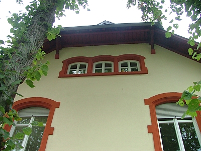 Schlicht ausgebildet ist das zur baulichen Gesamtanlage gehörende freistehende Pfarrhaus. Der von den Fenstergewänden zurückhaltend neugotisch charakterisierte Putzbau stellt den Gruppenzusammenhang insbesondere durch den getreppten Traufgiebel her. [1]
