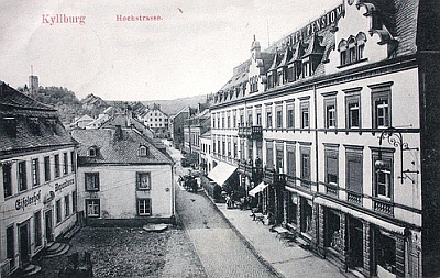 Die Hochstraße bildet - entgegen ihrem wohl neueren Namen - das am tiefsten gelegene Teilstück der Straße, die vom ehemaligen Stift bis zur Pfarrkirche Sankt Maximin auf dem Bergrücken entlangführt. Sie verband ursprünglich die Burg- mit der Pfarrkirchensiedlung und war - vom ehemaligen kurfürstlichen Rentamt (Nr. 1) abgesehen - bis ins frühe 19. Jahrhundert unbebaut. Die meisten Häuser entstanden erst mit dem wirtschaftlichen Aufschwung Kyllburgs nach der Eisenbahneröjfnung 1871.