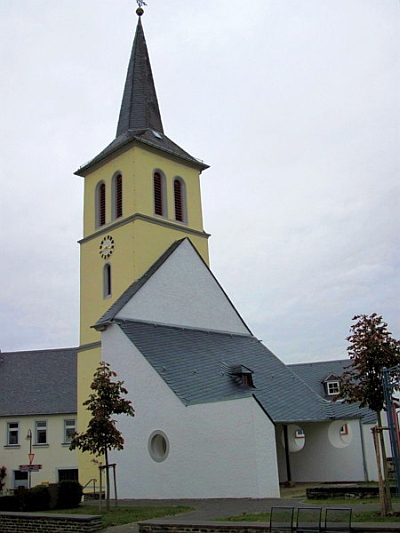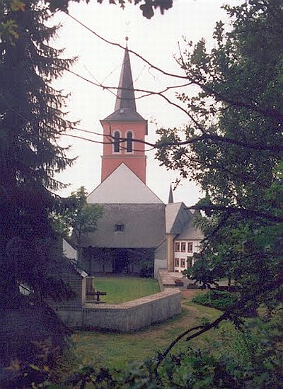 Westturm. 1870 errichteter, durch Gesimse geschiedener, dreigeschossiger Turm unter achtseitigem Schieferhelm. Sparsame rundbogige Durchfensterung und Zwillingsfenster als Schallarkaden; das Portal entfernt und vermauert. Die rippengewölbte Halle zum Gefallenengedächtnis umgestaltet unter Verwendung der Kreuzigungsgruppe des Kriegerdenkmals der 1920er Jahre. Dieses anstelle der Beifiguren Maria und mit Mutter und Soldat umgedeutet. Zur Umgebung gehört der Platz der alten Kirche und der Bereich des aufgelassenen Friedhofes. Die 1788 erbaute, 1825, 1844 und 1870 erweiterte alte Pfarrkirche wurde 1974 bis auf den Turm und die damit verbundene Giebelwand abgebrochen. Der umbaute Raum wurde durch eine Mauereinfassung kenntlich gemacht, der ehern. Kirchhof zur Grünanlage umgestaltet. Innerhalb des ehemaligen Schiffes ist das Friedhofskreuz aufgestellt. Zweiteiliger, gestufter Sandsteinsockel mit Fischrelief, darüber Kreuz und Korpus aus Gusseisen; etwa Mitte 19. Jahrhundert. [2]