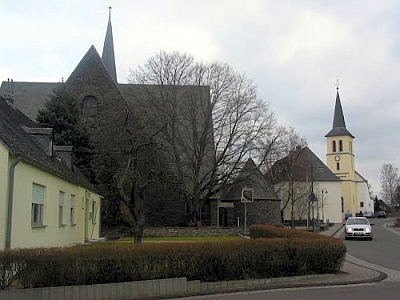 Von der alten Pfarrkirche im modernen Neubau übernommen sind eine barocke Muttergottes mit Jesusknaben und der von Pfarrer Peter Didas um 1900 gestiftete, gemalte Kreuzweg.