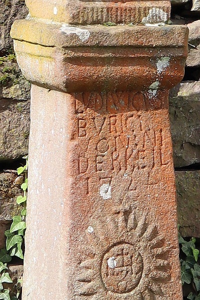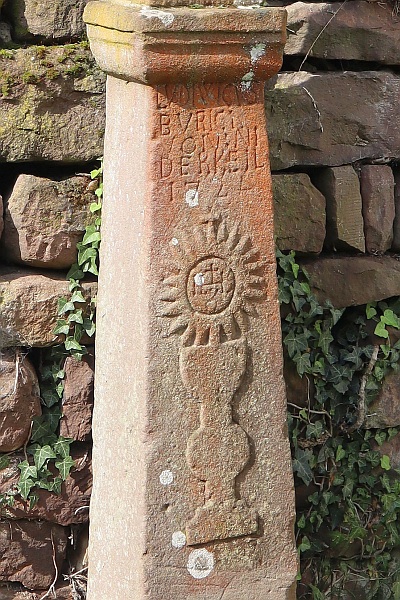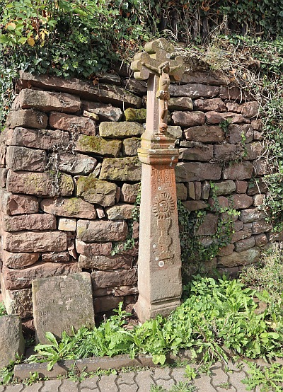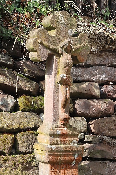 Zwischen Wohnhaus und Scheune steht an der Stützmauer zum höheren Gelände westlich des Gehöftes hin ein Schaftkreuz von 1724. Der Schaft stark nach oben verjüngt, auf der Vorderseite ein Kelch mit einer Hostie im Strahlenkranz und der Name des Stifters LUDIWICUS BURICH VON NIDERKEIL. Abschlußkreuz in Form eines Kleeblattkreuzes (vgl. das sehr ähnliche Kreuz in Usch, bei Schulstraße 2). [1]