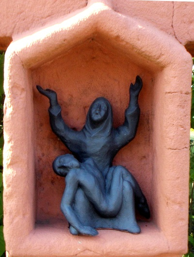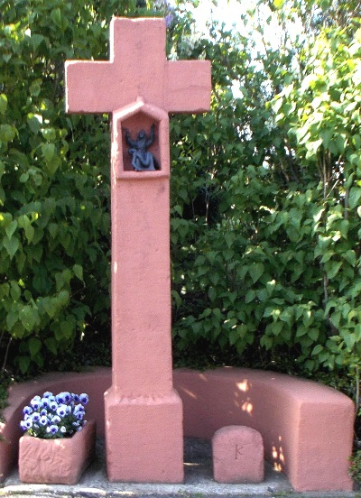 Hohes, schlichtes Balkenkreuz mit integrierter Nische unterhalb des Querbalkens, die von einem Wulst gerahmt wird. Der moderne Metallkorpus verdeckt ältere Dübellöcher. Die ungewöhnliche Form des Kreuzes findet in der weiteren Umgebung keine Parallele, weshalb eine Datierung unmöglich ist. [1]