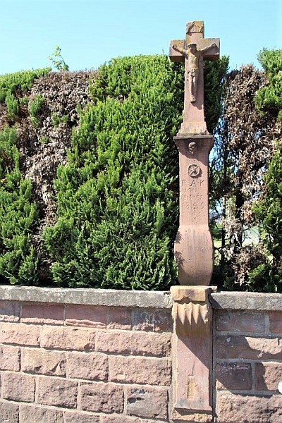 Ende der 1950er Jahre hat man das ehemals freistehende Wegekreuz in eine Sandstein-Stützmauer eingelassen, da es im Ersten und Zweiten Weltkrieg stark beschädigt wurde. Die Inschrift: