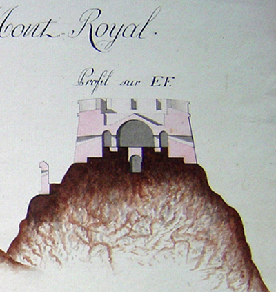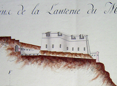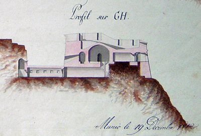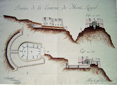 46,5 X 33,0 cm große aquarellierte Zeichnung "Dessein de la Lanterne du Mont Royal". Angefertigt in München am 19. Dezember 1812 durch Artillerie-Leutnant Philipp von Brand. Diese militärtechnische Zeichnung ist in einem tadellosen Zustand und wurde sehr wahrscheinlich von Leutnant von Brand während seiner Ausbildung angefertigt. Als Vorlage muss er Zugang zu Originalplänen gehabt haben. Die Zeichnung weist außerdem noch eine Originalität auf, da auf der Draufsicht F-E G-H (links unten im Bild) eine aufklappbare Papierklappe es erlaubt ins Innere des Festungswerks zu schauen. [1]
