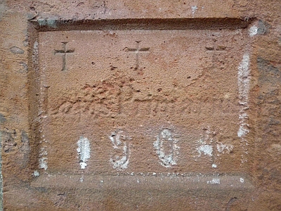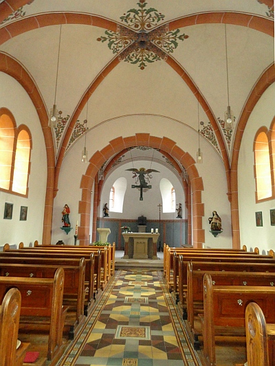 Bruchsteinsaal, 1904, ehemaliger Chorturm; südlich barockes Schaftkreuz, Sandstein, bezeichnet 1819. [1]