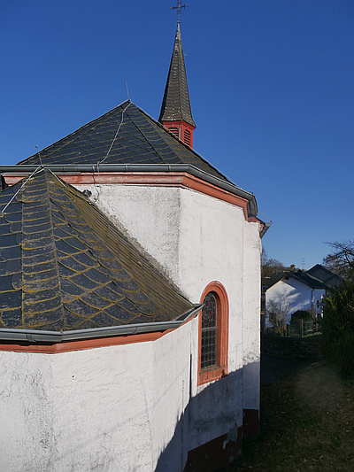 Kleiner, nach Südosten gerichteter Putzbau mit eingezogenem dreiseitig schließendem Chor. Die Langseite mit eingezogenem, dreiseitig schließendem Chor. Die Langseite nur von einem Rundbogenfenster besetzt, ebenso die Chorschrägen; über der abgewalmten Giebelseite ein verschieferter, achtseitiger Dachreiter mit Pyramidenhelm. Das schlichte rundbogige, durch Kämpfer- und Scheitelstein betonte Portal 1737 datiert. Das Innere mit holzverschalter Voutendecke und stichkappengewölbtem, sich im runden Sandsteinbogen öffnendem Chor. Raumbeherrschend ein 1772 gefertigter, hübscher steinerner Sarkophagaltar des Rokoko mit Säulenaufbau um eine Mittelnische. Zugehörig die Holzfiguren der Heiligen Johannes Evangelist und Paulinus (mit dem Kirchenmodell der 1757 geweihten Trierer Kirche Sankt Paulin) und einer Muttergottes in der Mitte; im Aufsatz Darstellung des Auge Gottes. Die Kirche ist ein schönes Beispiel für eine anspruchsvolle Kleine barocke Landkirche.