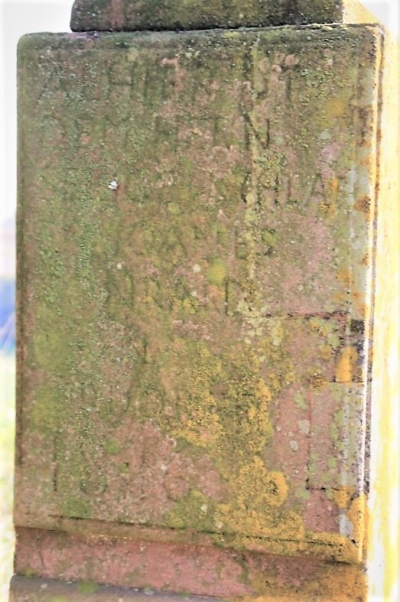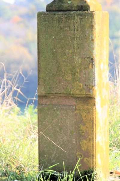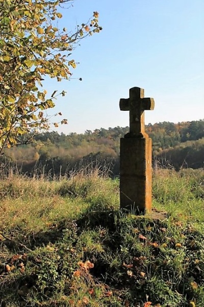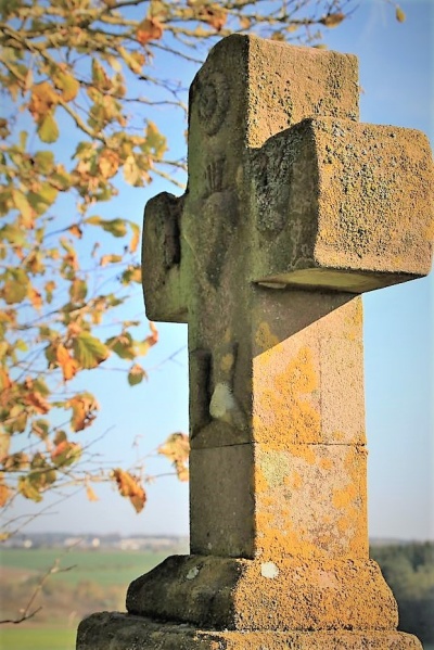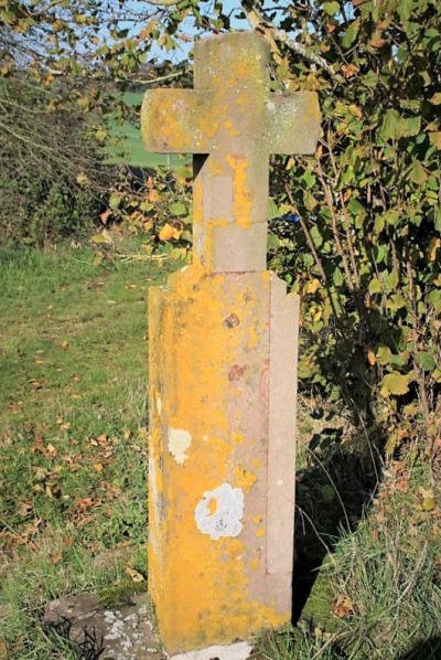 Kleines Balkenkreuz von 1816 mit Darstellung der Wundmale. Typisch für das frühe 19. Jahrhundert der hohe Sockel, dessen Inschrift ALHIER IST DEM HERN SELIG ENSCHLAFEN IOANES CONRARD VON ORDORFF einen Unglücksfall vermuten läßt. [1]