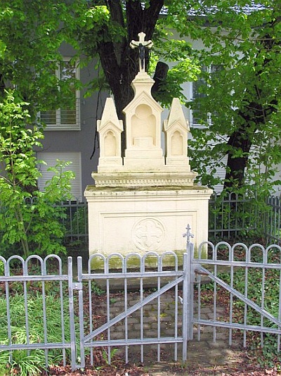 Steinaltar innerhalb Gitterumfriedung unter Linden- und Kastanienbäumen. [...] Mit einer zweiten Station errichteter Blockaltar. Der dreiteilige steinerne Nischenaufbau wird seitlich von Pyramidenabschlüssen und in der Mitte von einem Kreuz bekrönt. [1]