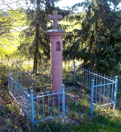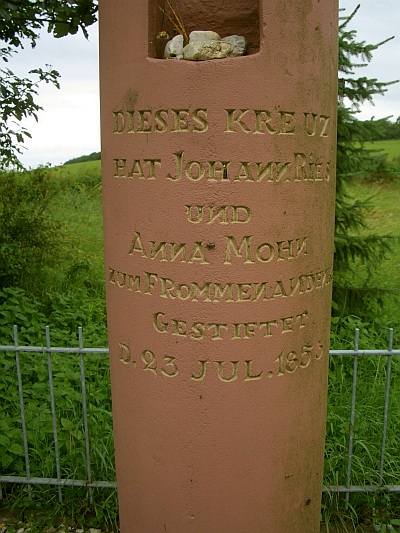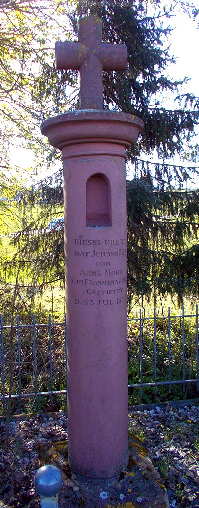 Laut Inschrift 1853 von Johannes Ries und Anna Mohn zum frommen Andenken gestiftet. Der im 19. Jahrhundert beliebte Kreuztyp hat die neue Funktion eines Friedhofkreuzes. [1]