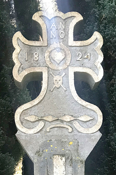 Aus einem Werkstück gearbeitetes Sandsteinkreuz, in dessen Pfeilerschaft Spiegel ausgearbeitet sind. Das Kreuz mit lilienförmigen Kreuzenden, Empiredekoration und Totenkopf an der Verbreiterung des Kreuzfußes sowie aufgelegtem Relief aus Dornenkrone, Herz und Kreuznägeln in der Mitte.