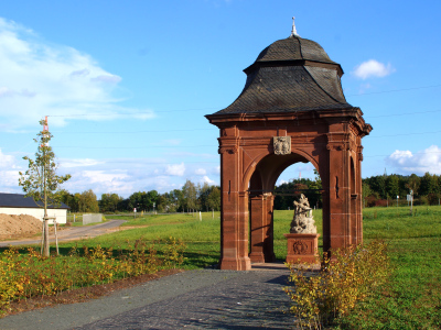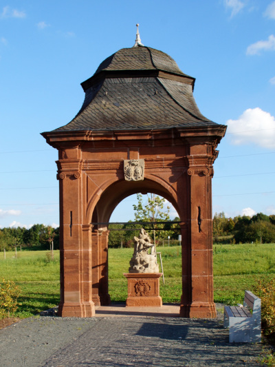 Prächtige, etwa 7,7 m hohe barocke Sandsteinkapelle über quadratischem Grundriß und unter geschweiftem, zur Haube gebrochenem Mansarddach.