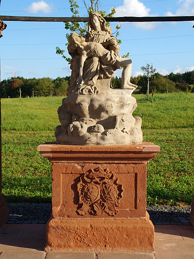 Am straßenseitigen Keilstein das Ehewappen Johann Hugo Casimir Edmund von Kesselstatt und Katharina Freiin Knebel von Katzenellenbogen nebst Bauzahl 1755. Die kreuzgratgewölbte Kapelle schützt ein Vesperbild auf geschlossenem Pfeilersockel. Hier das Doppelwappen wiederholt und die Datierung 1747. Über hohem, naturalistisch ausgearbeitetem Kalvarienberg vor dem Kreuz die bewegte Sandsteinpietá.