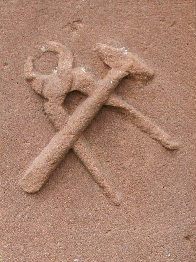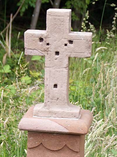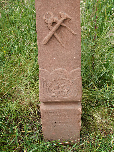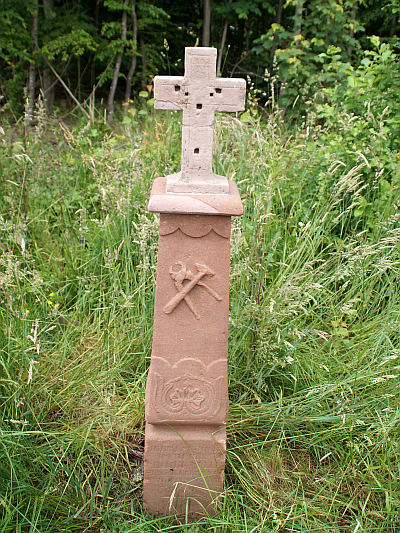 Schaftkreuz aus Sandstein, das am Fuß 1820 datiert ist. Der über eine Einschnürung mit Muschelschmuck wachsende Pfeilerschaft trägt die Schmiedewerkzeuge Hammer und Zange im Relief. Das Abschlußkreuz einfach und heute ohne Korpus. Totengedächtniskreuz für den hier verstorbenen Michael Müller aus Föhren (Michelskreuz). [1]