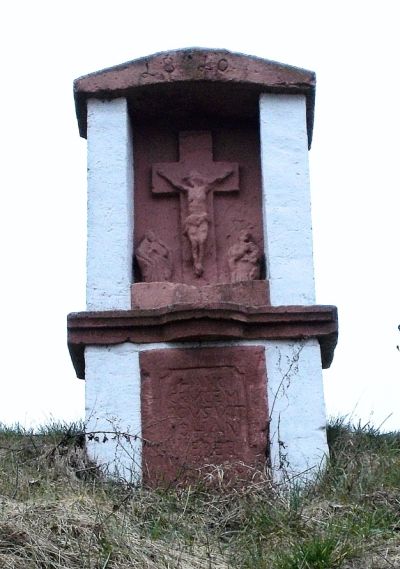 Zweiteiliger Aufbau aus einem Sockel mit Inschriftplatte (Stifter Johan Weber und Maria Margreta Hilgers, 1810) und, von einem ausladenden Gesims getrennt, eine flachbogige, dachförmig geschlossene Nische, die ein handwerklich gearbeitetes Kreuzigungsrelief umfaßt.