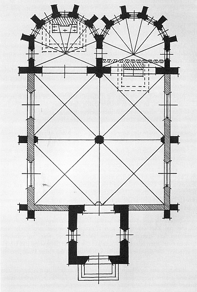 4. Grundriss der gotischen Marienkirche in Reilkirch mit quadratischem Laienraum und der Einmalsäule in der Mitte.