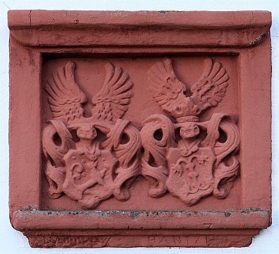 Von der sogenannten Burg als Spolie in den Neubau übernommener Wappenstein mit dem Doppelwappen Nassau-Hanxler samt Helmzier und Bezeichnung 1663. [1]