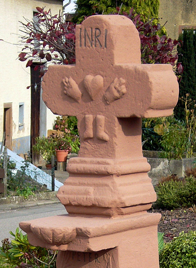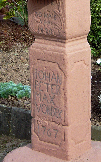 Aus zwei Teilen zusammengesetztes Schaftkreuz aus Rotsandstein. Der gebrochene Pfeilerschaft auf Setzstein 1767 datiert und mit Stifternamen Johan Peter Max von Be(cond) versehen. Der obere Schaftteil laut Inschrift 1820 von Peter Jonas renoviert und mit neuem Kreuz versehen. Dieses mit der Reliefdarstellung der fünf Wundmale Christi. [1]