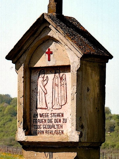 Entlang des auf die südliche Anhöhe führenden Bergweges und am Saum zum westlich davon gelegenen Weinberg stehende Kreuzweganlage von 1913. Vierzehn schlichte Sandsteinstationen, jeweils aus glattem Schaft, verdachtem Aufsatz und Abschlußkreuz; die Darstellungen neu. [1]