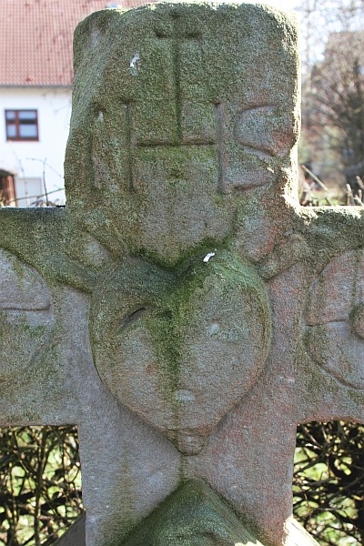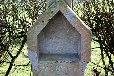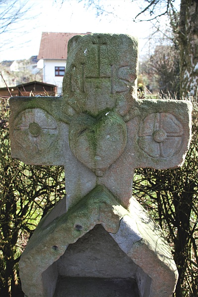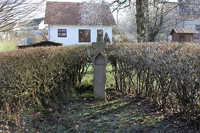 In einen sich verbreiternden spitzbogigen Nischenaufbau übergehender, rechteckiger Pfeilerschaft aus Sandstein. Die tiefe Nische schließt ein Balkenkreuz ab, das in der Mitte ein Herzrelief und an den Kreuzbalken Blütenrosetten und das IHS-Zeichen trägt. Am Schaft die Inschrift: