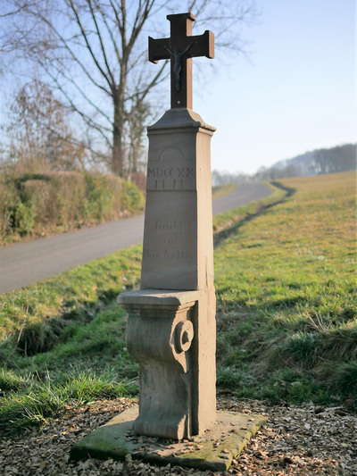 Wegekreuz südöstlich der Ortslage, Verlängerung der Straße Im Rollsgarten. Renoviertes Pfeilerkreuz mit Altarvorsprung auf Volutenkonsole. Der klassizisierende, sich verjüngende Schaft trägt die Datierungen 1720 für das Vorgängerkreuz und 1910 für die Erneuerung. [1]