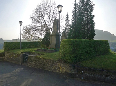 Der rechteckige, volutengeschmückte Sockel trägt die 2,50m große Statue des Erzengels Michaels als Drachentöter. Die Spitze seines Langschwertes in der rechten Hand stößt in den unter seinen Füßen sich windenden Satan. Der Erzengel Michael ist der Pfarrpatron von Steffeln. Sockel und Statue sind aus hellem Tuffstein.