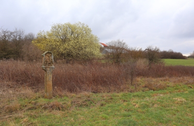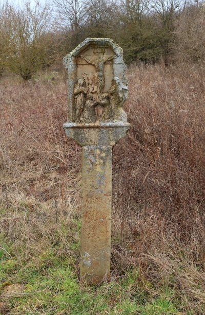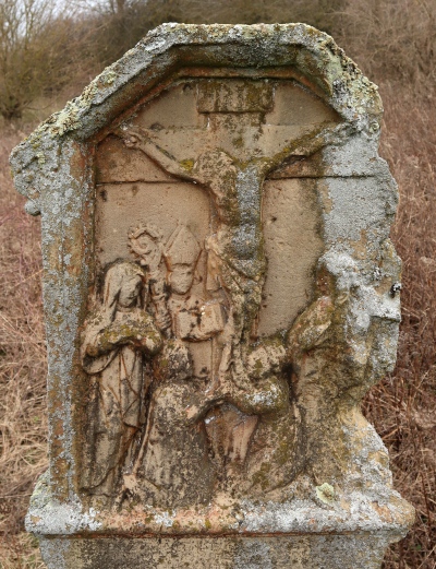 Bildstock aus grauem Sandstein in Art eines Schaftkreuzes. Sorgfältig ausgearbeitete Reliefdarstellung in einem dreiseitig verdachten, auf der