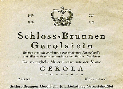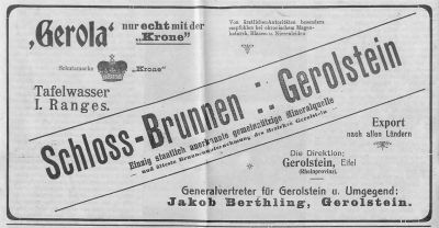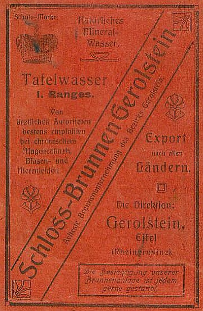 [...] Auf der gegenseitigen Wiese (Anm.: Wilma Herzog: die Wanderer vom Niederrhein hatten soeben das Eisenbahn-Denkmal erreicht und beschrieben.) erhebt sich das Gebäude des GEROLSTEINER SCHLOSSBRUNNEN, dessen Räumlichkeiten und Einrichtungen in liebenswürdiger Weise gezeigt werden. Im Gegensatz zu den Gerolsteiner Betrieben ist hier und da auch gern gestattet, den unter Glasfassung hervorsprudelnden Quell zu besichtigen. Interessant ist es den technischen Fortschritt der maschinellen Einrichtungen, der Spülapparate, der verschiedenen Füllapparate, sowie in der Herstellung flüssiger Kohlensäure während einer Abwesenheit von zehn Jahren zu beobachten. Staunend vernehmen wir den ungeheuren Umsatz dieses allerdings auch äußerst günstigen Sommers. 50.000 Flaschen werden täglich abgefüllt, dazu noch 200 Flaschen Kohlensäure. Selbst wenn man den Verlust von 1.000 täglich zerspringenden Flaschen in Abzug bringt, ergibt sich doch die ansehnliche Summe dieses mit 25 oder stellenweise gar mit 50 Pfennig bezahlten Getränkes. Nirgendwo ist das Kylltal so reich an alkalischen Säuerlingen, die mir ihrem starken Gehalt an freier und gebundener Kohlensäure, zum Teil auch Lithium, in mächtigen Sprudeln aus dem Talboden hervorquellen und den Ruf der weltbekannten Gerolsteiner Mineralwasser begründen. Der stärkste dieser Eifelsäuerlinge entspringt dem unterhalb Gerolstein gelegenen Birresborner Mineralbrunnen. Schwächere befinden sich in Gerolstein selbst, wir nennen: Florabrunnen, Gerolsteiner Sprudel, Gerolsteiner Brunnen, Hansa- und Charlottenquellen. Letztere verwerten die ihnen entströmende Kohlensäure zugleich zur Herstellung von Bädern, Duschen zu kurmäßigem Gebrauch. Ist das ein Geklirr von Flaschen, ein Rasseln und Knarren von Wagen und Kisten, das vom Hofe des nahen Florabrunnens noch abends spät zu unserem Zimmer (Anmerk.: Wilma Herzog: Die Wanderer waren in Gerolstein im Hotel Gerolstein zu Gast) heraufdringt. Die Gluthitze des Sommers hat den Konsum derartig gesteigert, daß Tag und Nacht geschafft werden muss, um alle Aufträge erledigen zu können.