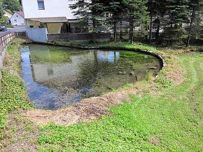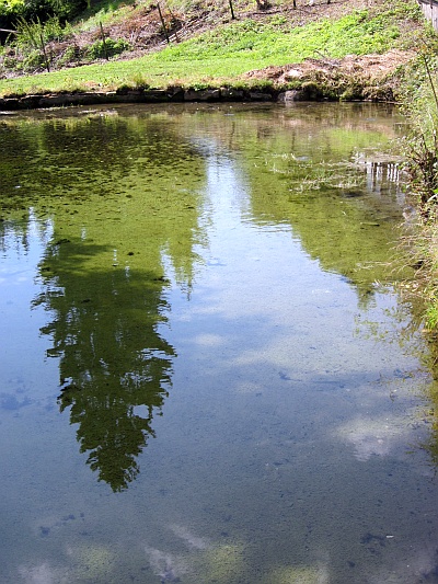 Der Haupt-Quellaustritt befindet sich oben rechts, jedoch kann man auch im Teich selbst sprudelnde Austritte anhand von aufsteigenden Blasen erkennen. Die Schüttung der Quelle beträgt jahreszeitlich bedingt ca. 7.000 bis 10.000 Kubikmeter pro Tag. [2]