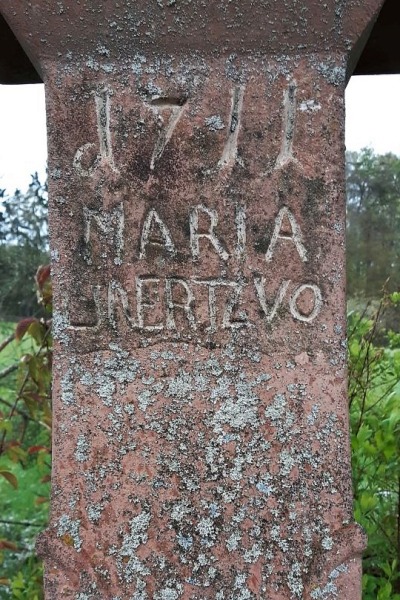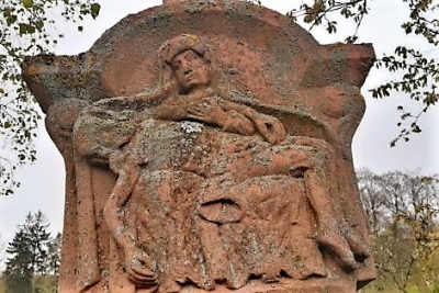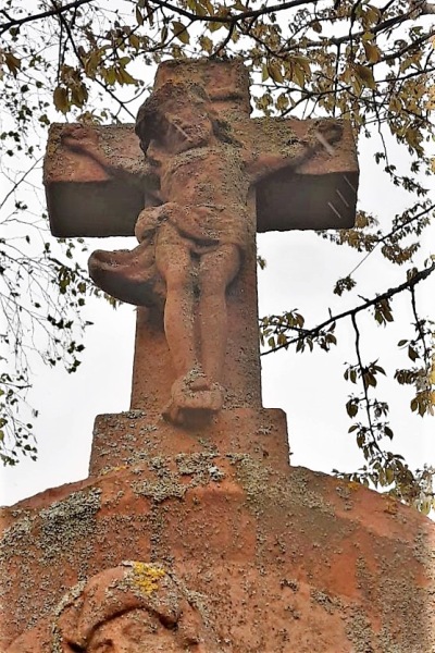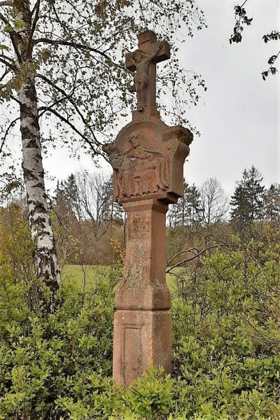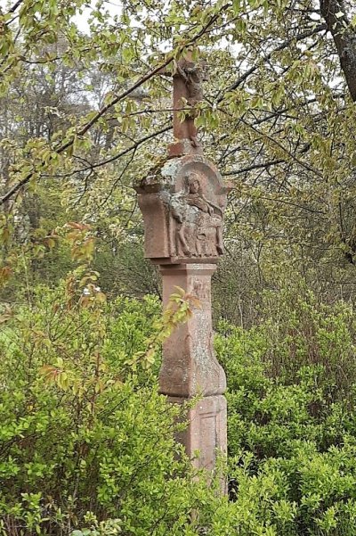 Barockes Schaftkreuz aus rotem Sandstein mit Pietàrelief und kleinem Abschlußkreuz. [1]
