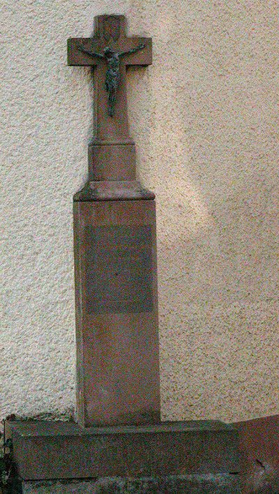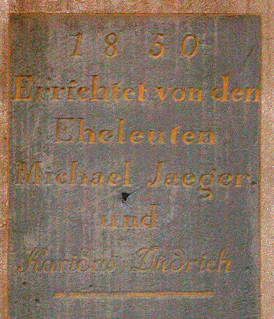 Wegekreuz. Schaftkreuz aus rotem Sandstein in schlichten klassizistischen Formen, bezeichnet 1850. Metallkorpus. [1]