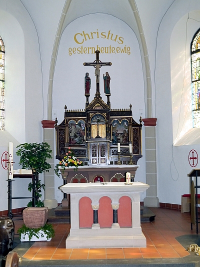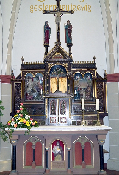 Ursprünglich muß die Kirche einen Hauptaltar und 2 Nebenaltäre besessen haben, die aber aus der Kirche entfernt und durch einen Hauptaltar im neoromanischen Stil ersetzt wurden. Letzterer wurde am 12.5.1902 durch Bischof Felix Korum konsekriert.