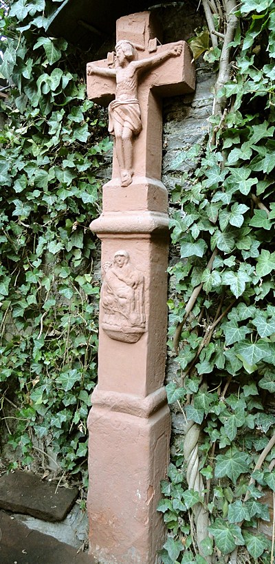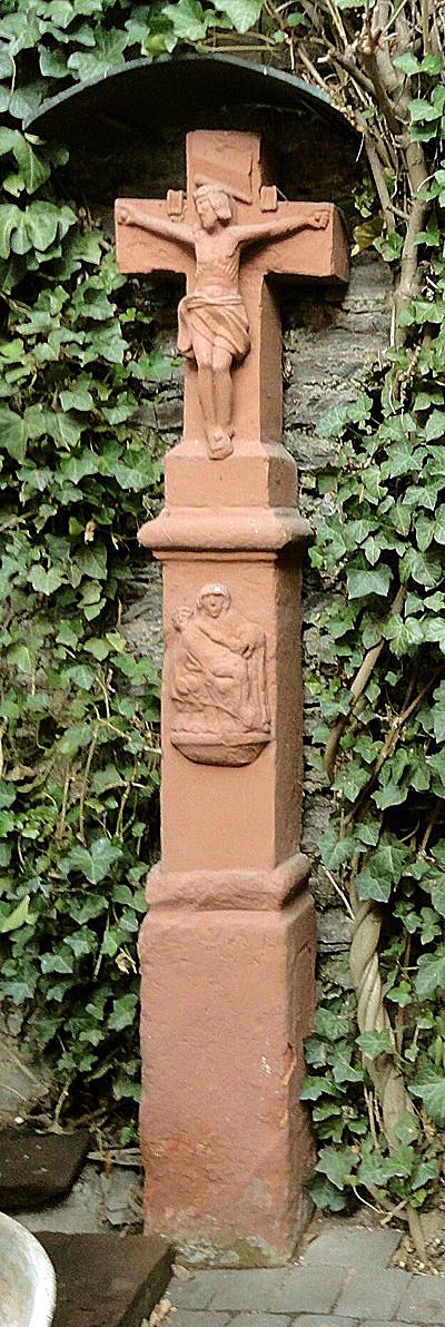 Vor einer Kellermauer aufgestellt ein Wegekreuz mit Pietà-Relief am Schaft, wohl 18. Jahrhundert. [1]