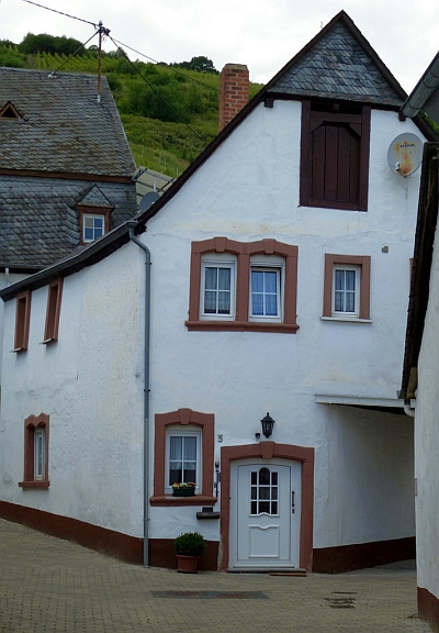 Zurückliegender zweigeschossiger Putzbau auf trapezförmigem Grundriß, teils massiv mit segmentbogigen Öffnungen (die Haustür im Scheitelstein bezeichneteichnet 1755), teils Fachwerk. Das Erdgeschoß an der Ostecke für eine Durchfahrt stark abgeschrägt. [1]