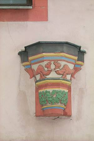An Schaffneigasse 1. In die Fassade eingelassen zwei gotische Dienstkapitelle mit Darstellung von Tieren und Fabelwesen, angeblich aus der Liebfrauenkirche auf dem Göckelberg. [1]