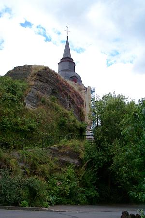 "Auf diesem Felsen will ich meine Kirche bauen": Diese bekannten Worte Jesu an Simon Petrus aus dem Matthäus-Evangelium (16, 18) passen besonders gut auf das Bild, das die Steffeler Kirche abgibt: Sie thront auf einem steil aus dem Talboden aufwachsenden Tufffelsen über dem Dorf, der wohl bereits schon in spätrömischer Zeit eine Kultstätte trug. Im Hochmittelalter stand auf dem Plateau eine Burg, was eine Urkunde aus dem Jahre 1282 belegt. Als Relikt dieser Burganlage, an deren Stelle heute die Kirche steht, sehen einige Forscher in der heutigen Sakristei die frühere Burgkapelle. Nachdem diese dann für die wachsende Dorfbevölkerung zu klein geworden war, scheint um die Mitte des 16. Jahrhunderts eine neue Kirche gebaut worden zu sein. Über diese Kirche, die nach 1660 die Pfarrkirche der neuen Pfarrei Steffeln war, klagte jedoch 1687 der dritte Steffeler Pfarrer, Johannes Blum, bei Weihbischof von Anethan: "Die Kirche ist gänzlich zerfallen und droht Gefahr. Die Pfarrgenossen und der Zehntherr (der Graf von Manderscheid- Gerolstein) weigern sich, die Reparatur der Kirche zu besorgen". Trotz der Klagen ließen sich die Steffeler noch über zwanzig Jahre Zeit: 1699 wurde die baufällige Kirche niedergelegt. Aus dem Visitationsbericht von Dechant Hoffmann vom 27.7.1713 erfahren wir dann: "Vor wenigen Jahren haben sie eine neue Kirche gebaut mit Ausnahme des Turms. Das sacrarium usw. Ist in gutem Zustande und die neue Kirche zur vollen Zufriedenheit ausgestattet." Das mit dreiseitigem Chor geschlossene Kirchenschiff ist ein einfacher verputzter Bruchsteinbau mit Kreuzgewölbe und mit vier rund geschlossenen Fenstern auf jeder Seite, dazu zwei im Chor. Das Kirchenschiff zeigt die im Erzbistum Köln, zu dem Steffeln bis 1930 gehörte, noch lange nachwirkende spätgotische Formensprache. Der an der Ostseite angebauten Sakristei wurde wahrscheinlich jetzt ihre geschweifte Barockhaube aufgesetzt.