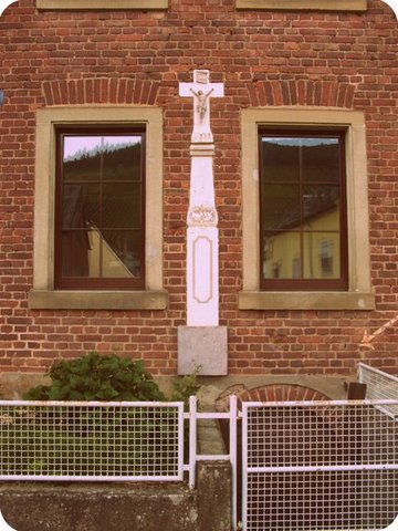 In die Hauswand eingelassen ein hohes Schaftkreuz, bezeichnet 1800. Jüngerer Metallkorpus. [1]