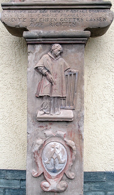 Auf einem Wegekreuz von 1672 in Lieser (Kirchstraße) ist Laurentius (10. August) als Diakon mit der Dalmatik als Zeichen seines Amtes dargestellt. Dazu trägt er die Siegespalme des Märtyrers. Vier Tage vor Laurentius eigenem Tod (258) wurde Papst Xystus II. gemartert: Der Diakon verteilte daraufhin das Geld der Kirche an die Armen und Rechtlosen, so daß die habgierigen Verfolger leer ausgingen. Sein Martyrium auf dem Feuerrost soll er mit Humor und Heiterkeit ertragen haben. Man mag das nicht glauben, doch die Legende hält sich hartnäckig. Die Darstellung auf dem Kreuz in Lieser zeigt ihn daher auch gelassen und freundlich.