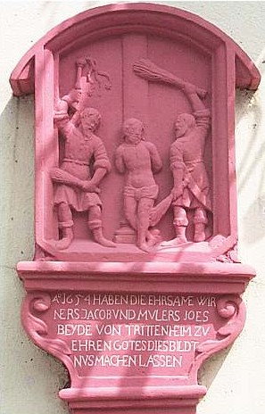 Bildstock, bezeichnet 1654 (oder 1657). Darstellung auf der Reliefplatte: Geißelung Christi.