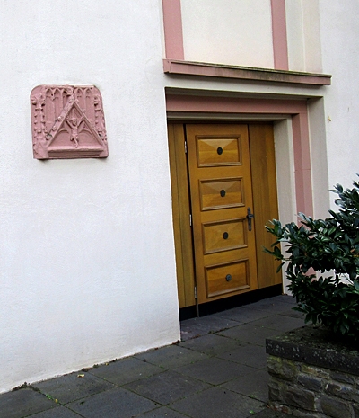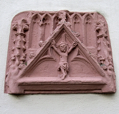 Neben dem Portal eingemauert ein kleines gotisierendes Kreuzigungsrelief von 1671. [1]