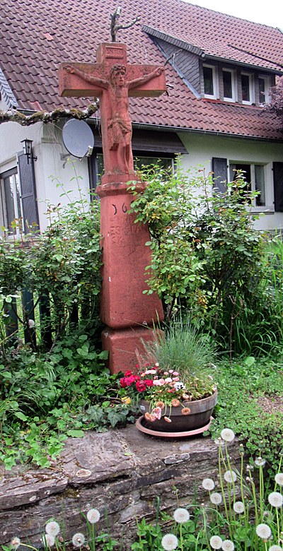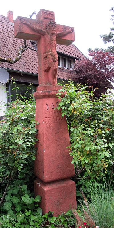Bezeichnet 1659. Schaftkreuz aus rotem Sandstein mit kurzem Schaft, das große Abschlußkreuz mit schwerem Korpus. [1]