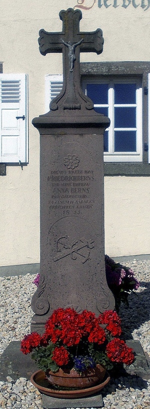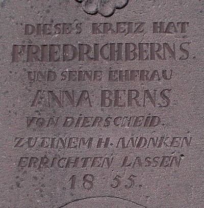 Karl-Kaufmann-Weg, an der Abzweigung Mühlenweg. Wegekreuz, bezeichnet 1855. Schaftkreuz in nachklassizistischen Formen. In jüngster Zeit von der Abzweigung Zum Kellerberg an den heutigen Standort versetzt. [1]
