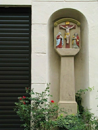 An Karlstraße 9 (lt. Katasterplan 8). Kreuzigungsbildstock, mit offenbar jüngerer Jahreszahl bezeichnet 1624. Wohl stark überarbeitet. [1]