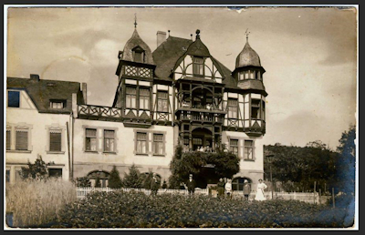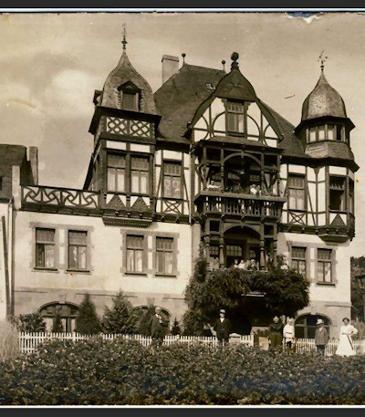Ein Foto, dass noch aus der Zeit vor dem Umbau zum Hotel datiert sein muss. Auf der linken Seite ist zu sehen, dass dort eine Terrasse über dem 1. OG war. Erst nach dem Umbau zum Hotel wurden dort Zimmer nachträglich errichtet (nach vorn zur Straße und nach hinten zum Garten). [2]