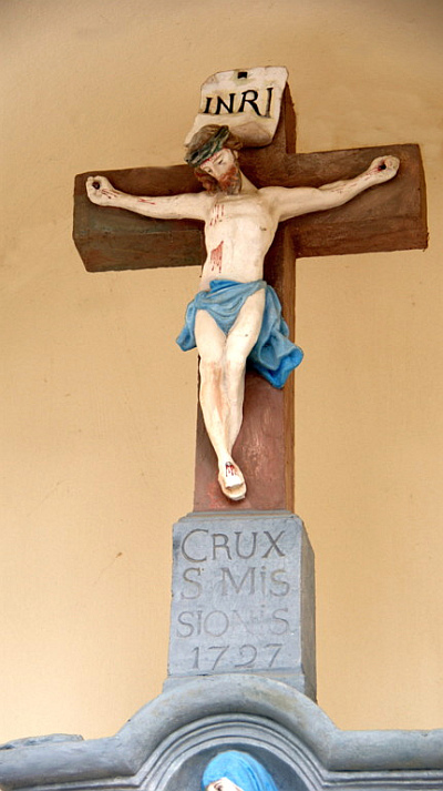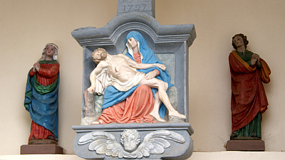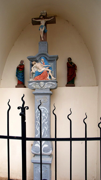Die Gartenmauer des Pfarrhofs unterbricht eine kleine, offene Kapelle mit kielbogig geschwungenem Dach. Darin ein Bildstock mit Pietà-Relief, bezeichnet 1681, und aufgesetztem Missionskreuz, bezeichnet 1727. [1]