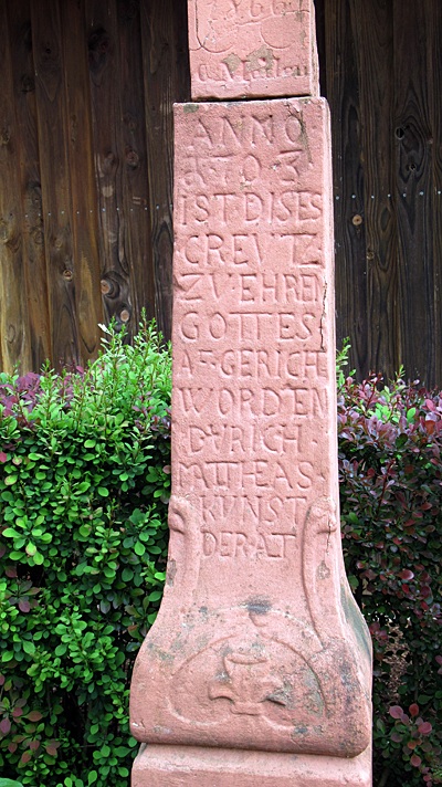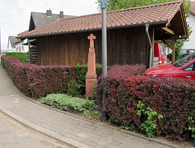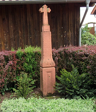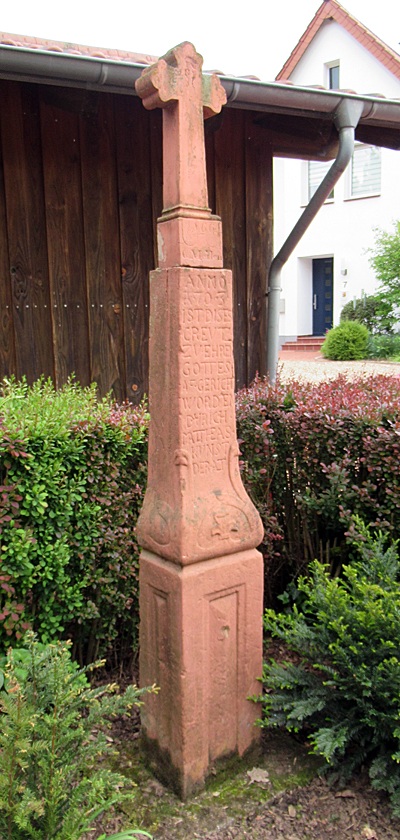 Schaftkreuz aus rotem Sandstein, der Schaft bezeichnet 1703, das Abschlußkreuz bezeichnet 1866. [1]