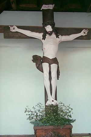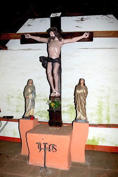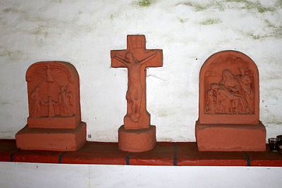Seitlich in der Kapelle aufgestellte Steinplastiken Taufe, Kreuzigung, Pietà