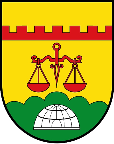 Wappenbeschreibung: Zwischen einem durch Zinnenschnitt von Gold und Rot geteilten Schildhaupt und einem grünen Fünfberg, darin eine silberne Mausefalle, in Gold eine rote Waage.